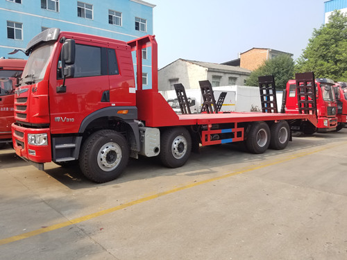 前四后八平板車配置:WP10.350E53,法士特10檔高低速,解放悍威駕駛室,13T雙后橋,300雙層大梁,1100R20鋼絲輪胎,軸距:1900+3200,3450+1350,整車尺寸:10000,11000X2500X3100,ABS,電動(dòng)門窗,行車記錄儀,氣囊座椅,原廠空調(diào).